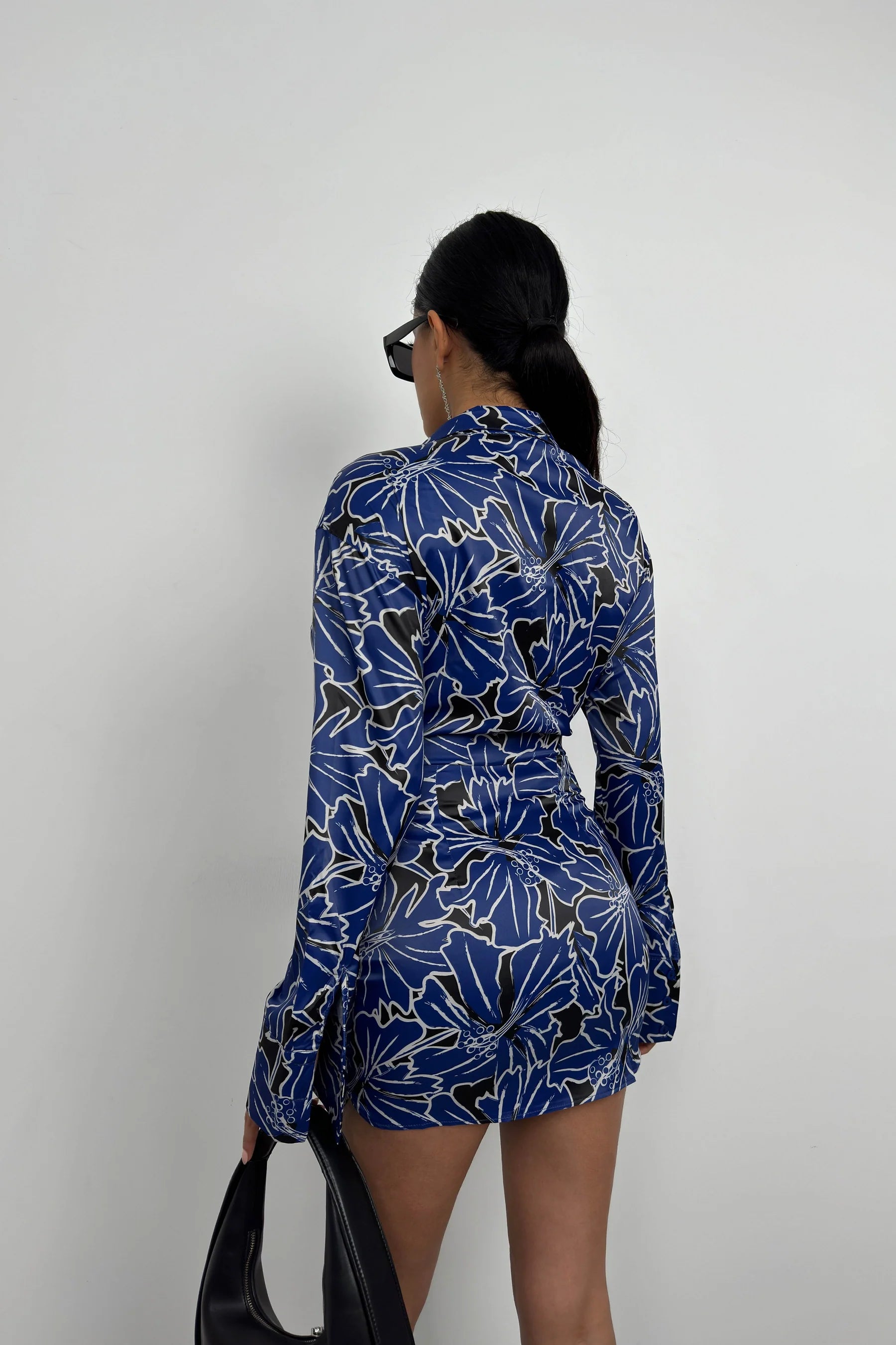 Patterned Fabric, Tie Detail, Long Sleeve, Shirt Collar, Cuffed, Mini Dress